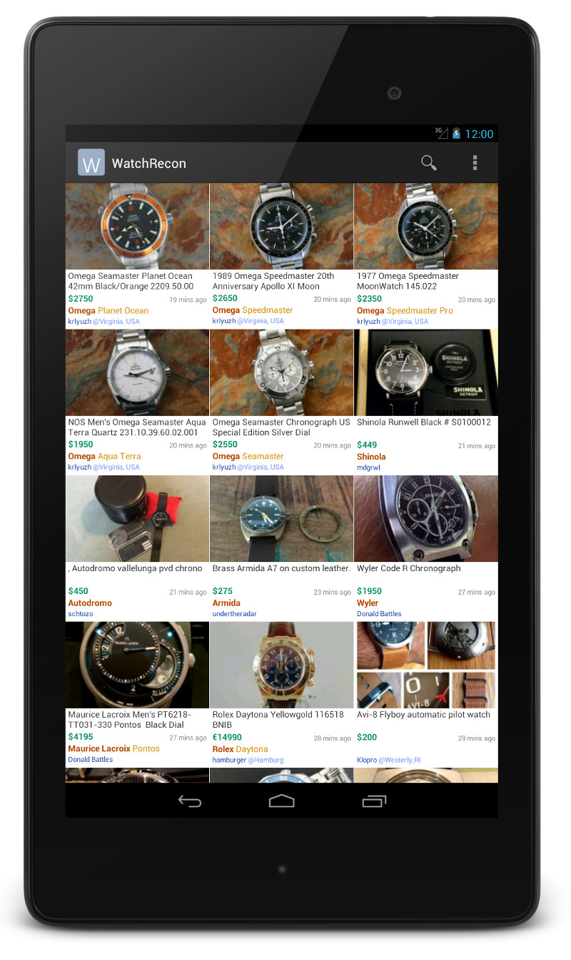 To install this free app, simply visit this link or search for "watchrecon" with the Google Play Store app. The Android version of WatchRecon is designed with the phone and tablet (screenshot) form factors in mind in order to provide a more friendly and faster browsing experience. Now you can check out used watches and get your fix easily on the road!